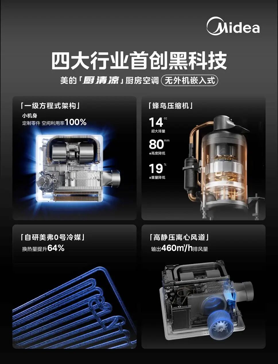 多年深耕科技,让美的在厨房空调领域积累了大量的宝贵经验。美的「厨清凉」厨房空调系列通过搭载专利石墨烯涂层翅片、自研美弗0号冷媒、行业领先蜂鸟压缩机、滤油黑魔盒等多项核心科技,有效解决了厨房高温、重油烟环境下空调使用的难题。